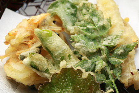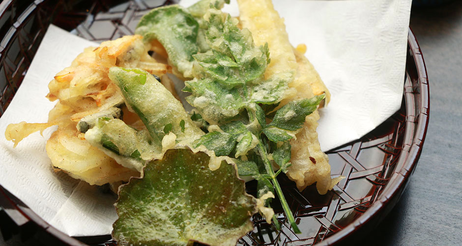 旬の山菜や野菜の天ぷらは、できるだけ鮮度の良いものを提供する為に地元産にこだわっています。